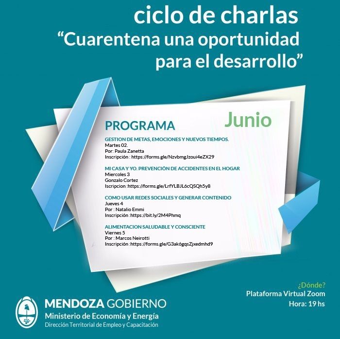- Martes 2 de junio, desde las 19: “Gestión de metas, emociones y nuevos tiempos”. Disertante: Paula Zanetta. Inscripción: https://forms.gle/NzvbmgJzoui4eZX29
