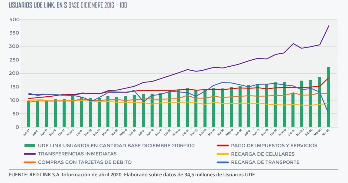 La Red Link, en el reporte Uso de Dinero Electrónico (UDE) que difunde su página web, informó que en Argentina hay 36,4 millones de personas que utilizan dinero electrónico y que por pandemia del coronavirus la cantidad de usuarios ha crecido 22,6%. De hecho, en el primer mes de la cuarentena se sumaron más de 2,6 millones de usuarios, mientras que en los últimos 12 meses ha sido 5,5 millones lo que accedieron a las distintas plataformas contempladas dentro del estudio de Uso del Dinero Electrónico