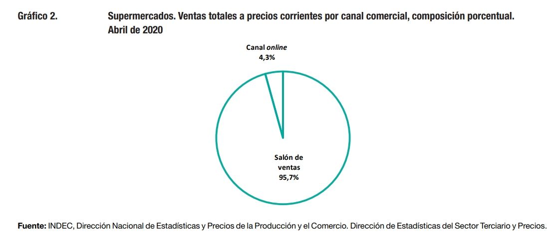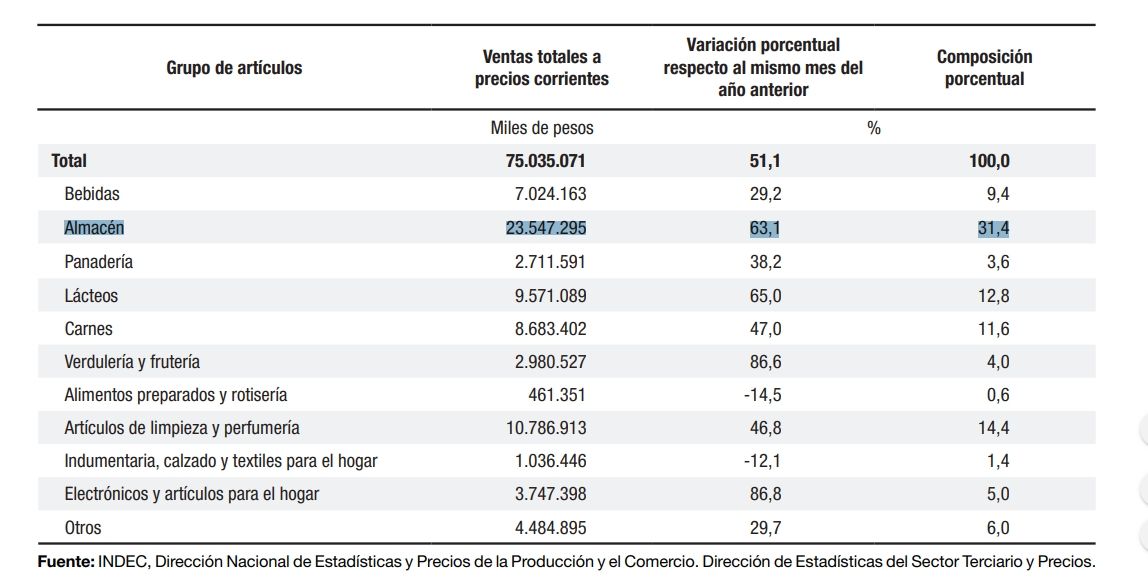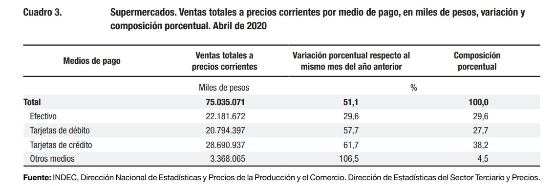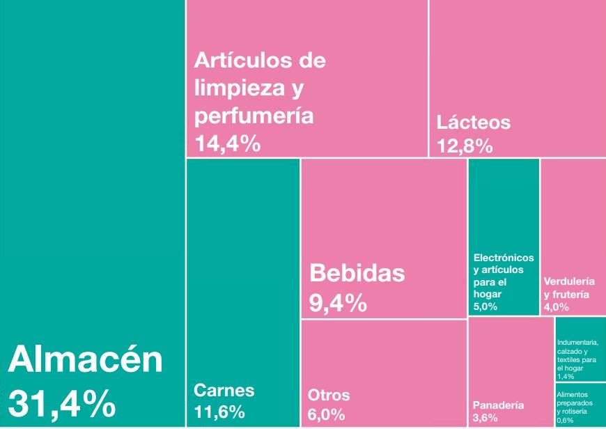 Según grupo de artículos, en supermercados los que más crecieron sus ventas respecto de abril de 2019 fueron los “Electrónicos y artículos para el hogar”, 86,8%; “Verdulería y frutería”, 86,6%; “Lácteos”, 65,0%; y “Almacén”, 63,1%. Y los principales rubros son almacén, artículos de limpieza y perfumería, y lácteos: