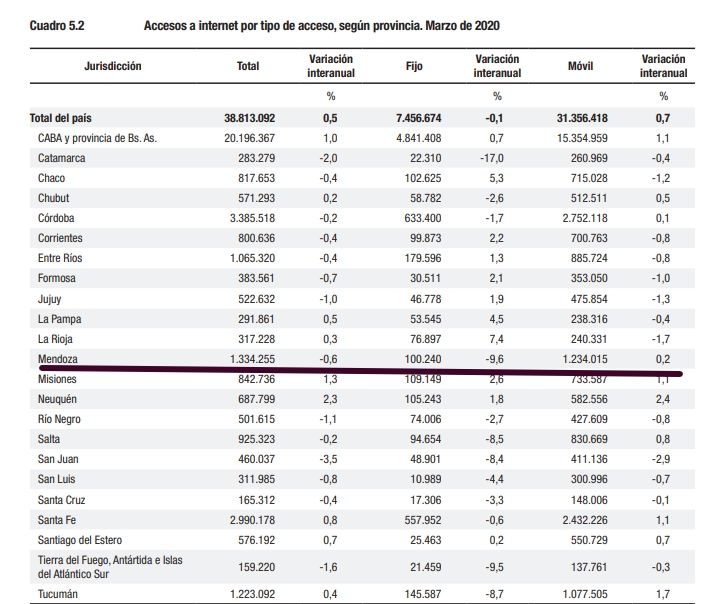 Entre marzo de 2019 y 2020, Mendoza perdió el 9,6% de los accesos a la red por telefonía fija, mientras que vía celulares u otros dispositivos móviles apenas varió, en positivo, 0,2%, por lo que.el acceso total a la Red en Mendoza cayó 0,6%. Las otras provincias de Cuyo también registraron leves retrocesos en el acceso total: -0,8% en San Luis y -3,5% en San Juan.
