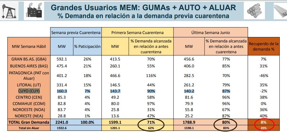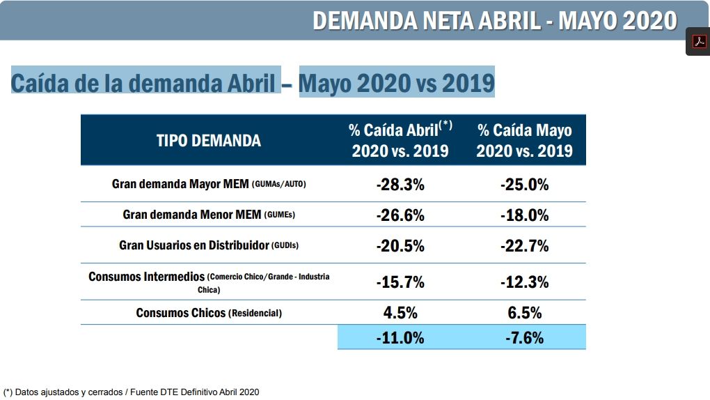 Distinta la realidad en los comercios e industrias chicas, con descenso de consumo de electricidad (respecto de 2019) de hasta 28,3%, tal como lo indica el siguiente documento de CAMMESA: