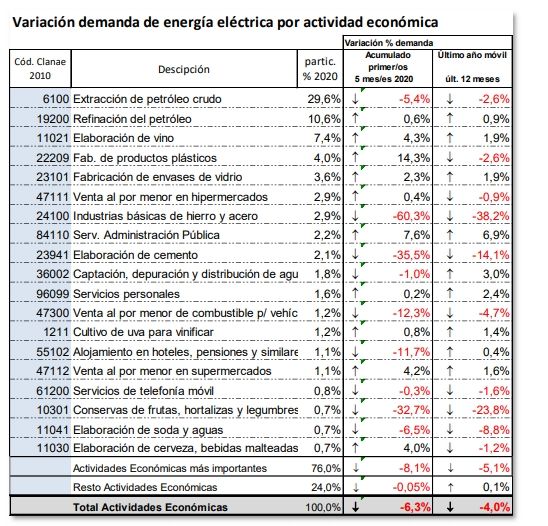 Respecto de la relación entre consumo eléctrico y caída de las actividades, el último informe técnico del EPRE recorre no solo lo sucedido en las principales actividades entre enero y mayo, sino también cómo fue entre mayo de 2019 y mayo de 2020, lo que describe mejor la situación de cada actividad, ya que también refleja el grado de impacto de la recesión económica en las mismas. Y el principal dato es que en los últimos 12 meses la variación en la demanda de electricidad en todas las actividades económicas fue, en promedio, -4% (y -6,3% solo entre enero y mayo de 2020).