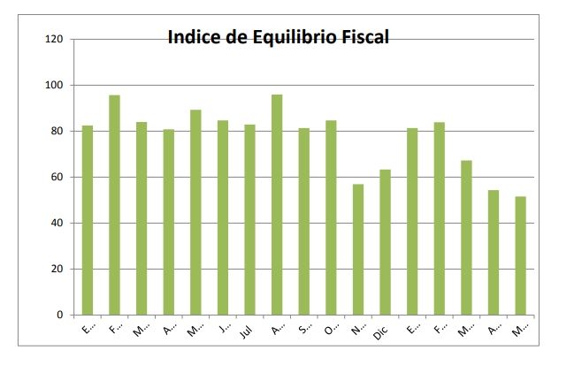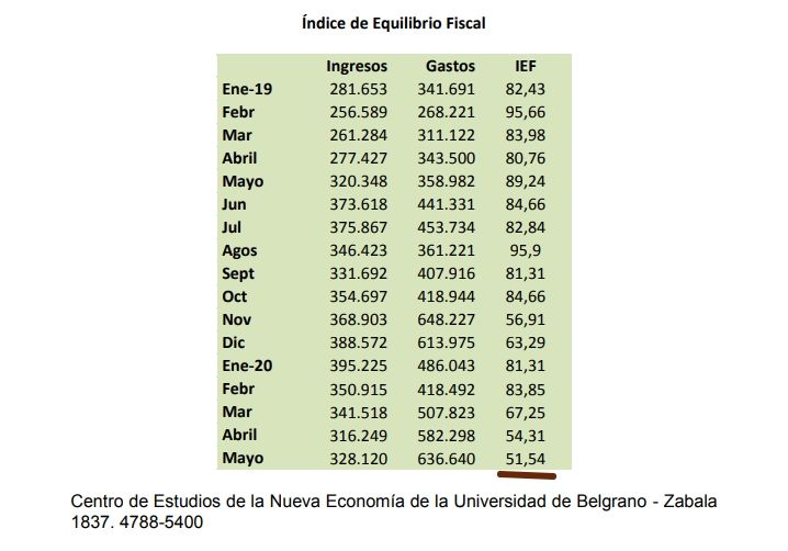 La situación fiscal en Argentina se agravó en mayo último, según un indicador elaborado por la Universidad de Belgrano, de la ciudad de Buenos Aires, en el que registró más gastos que ingresos en las arcas públicas. Se trata del Índice de Equilibrio Fiscal, que se calcula como el cociente entre los gastos y los ingresos totales (el valor 100 significa equilibrio, si supera a 100 entonces hay superavit y si baja de 100, entonces hay déficit). En mayo último dio 51,4%, el valor más bajo desde enero de 2019, quiere decir, que lo que está creciendo es el déficit: