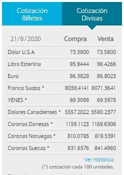 El dólar abrió hoy a $ 72,50 para la compra y a $ 77,50 para la venta en la pizarra del Banco Nación, en los mismos valores de cierre del viernes.