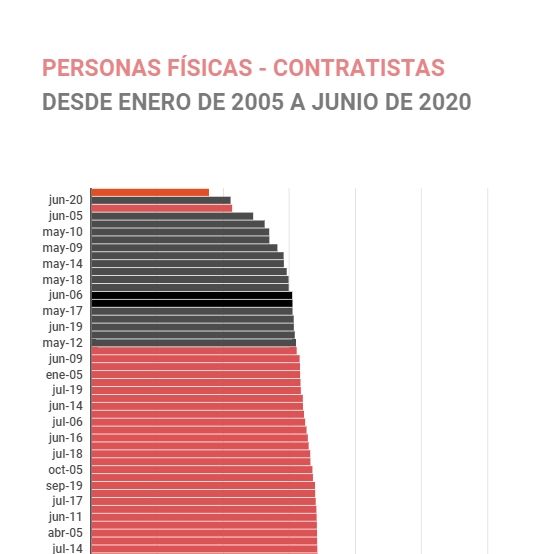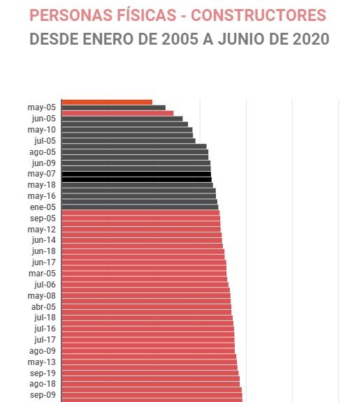 Este gráfico muestra el total de individuos, personas físicas y todo tipo de sociedades que se dedican a la construcción desde las labores de constructores, contratistas y subcontratistas. El dato es que en los 187 meses transcurridos entre enero de 2005 y junio de 2020, los meses 5º y 9º con peores datos en cuanto a cantidad de empresas y personas que se dedican a esta labor son mayo y junio de 2020, respectivamente.
