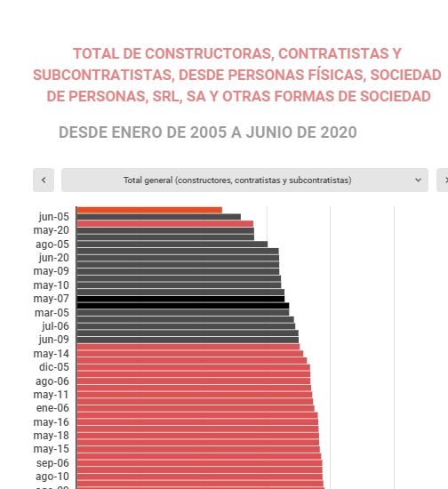 El Instituto de Estadísticas y Registros de la Industria de la Construcción, en sus series estadísticas, difunde la evolución de las empresas del sector en actividad y por tipo de sociedad y labor, en todo el país, desde enero de 2005 en adelante. Los siguientes cuadros son un ranking que ubica el contexto presente de la pandemia respecto de lo que han sido todos los períodos de la actividad en los últimos 15 años.