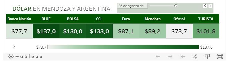 Empezando por el oficial, a 73,7 pesos; la divisa en el Banco Nación, 77,7 pesos; 89,2 pesos en Mendoza, según la web de Montemar y por encima de los cien pesos, el dólar turista (101,8 pesos), el dólar Bolsa (130 pesos), el contado con liqui (133 pesos) y finalmente, el dólar blue, a 137 pesos.