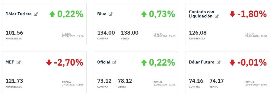 El dólar oficial, por su parte, continúa con su ritmo de devaluación diario y sube un 0,22%, ubicándose en $78,12 para la venta y $73,12 para la compra. En tanto el mayorista también sube un 0,11% y se ubica en $73,94.