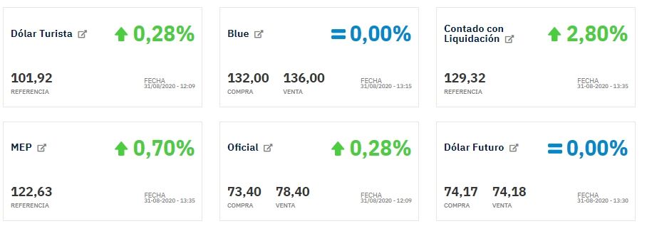 Con respecto a los dólares bursátiles, el dólar CCL (Contado con Liquidación), que se utiliza para sacar divisas al exterior, sube 2,80% este lunes y se vende a $129,32, mientras que el dólar MEP o Bolsa sube 0,70% y se vende a $122,63.
