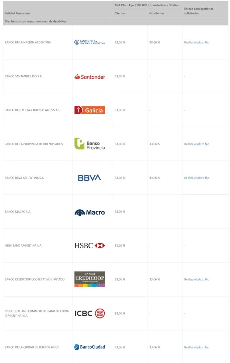 Los diez bancos más grandes del país que informan cuánto pagan por los plazos fijos a través de la web ya se plegaron a los nuevos valores según un relevamiento que realizó el propio Banco Central y solo seis de los que informan sus tasas aún no actualizaron su valor mínimo.