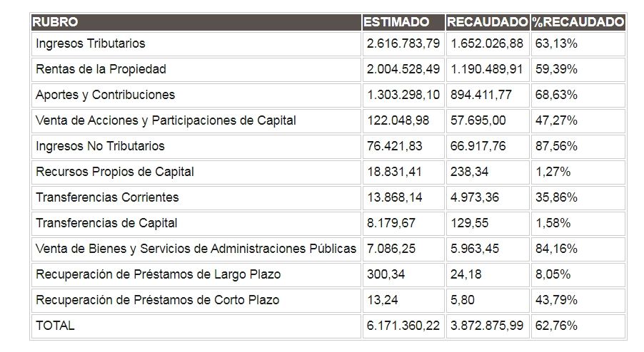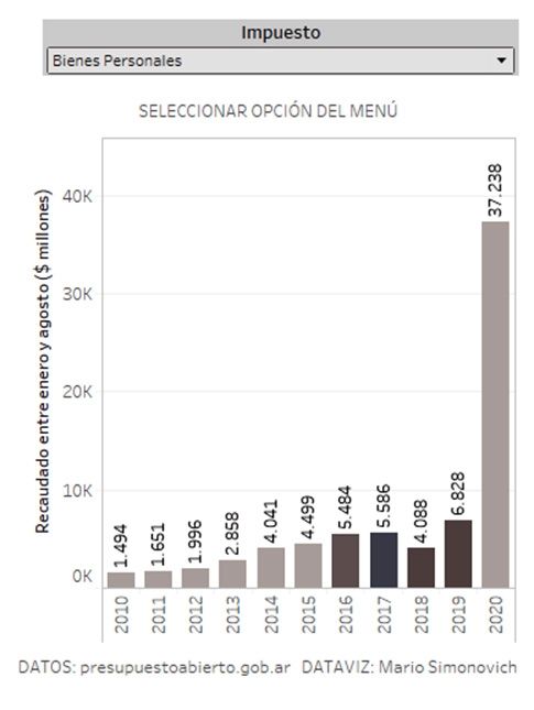 Según los datos oficiales difundidos en presupuestoabierto.gob.ar, entre enero y agosto de 2010, el 60,56% de los ingresos fueron impuestos, 26,7% en Contribuciones y el 9,4% en Rentas a la Propiedad. Mientras que entre enero y agosto de 2020, el 42,6% de lo que ingresó al Estado han sido impuestos, el 30,74% Rentas de la Propiedad y el 23,09% en Aportes y Contribuciones. En la siguiente imagen cuánto -en dinero y porcentaje del total- ha recaudado el Estado nacional en impuestos:
