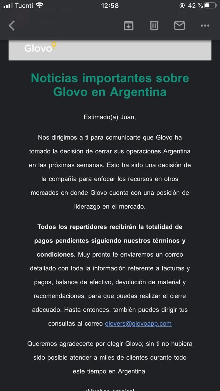 Muchos repartidores de Glovo compartieron en redes sociales el comunicado que recibieron. La empresa cuenta con cerca de 6.000 trabajadores en la Argentina que se quedarían sin trabajo en las próximas semanas.