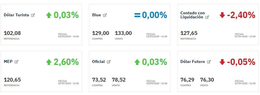 Con respecto a los dólares bursátiles, el dólar CCL (Contado con Liquidación), que se utiliza para sacar divisas al exterior, se desploma un 2,40% este miércoles y se vende a $127,65, mientras que el dólar MEP o Bolsa sube 2,60% y se vende a $120,65.