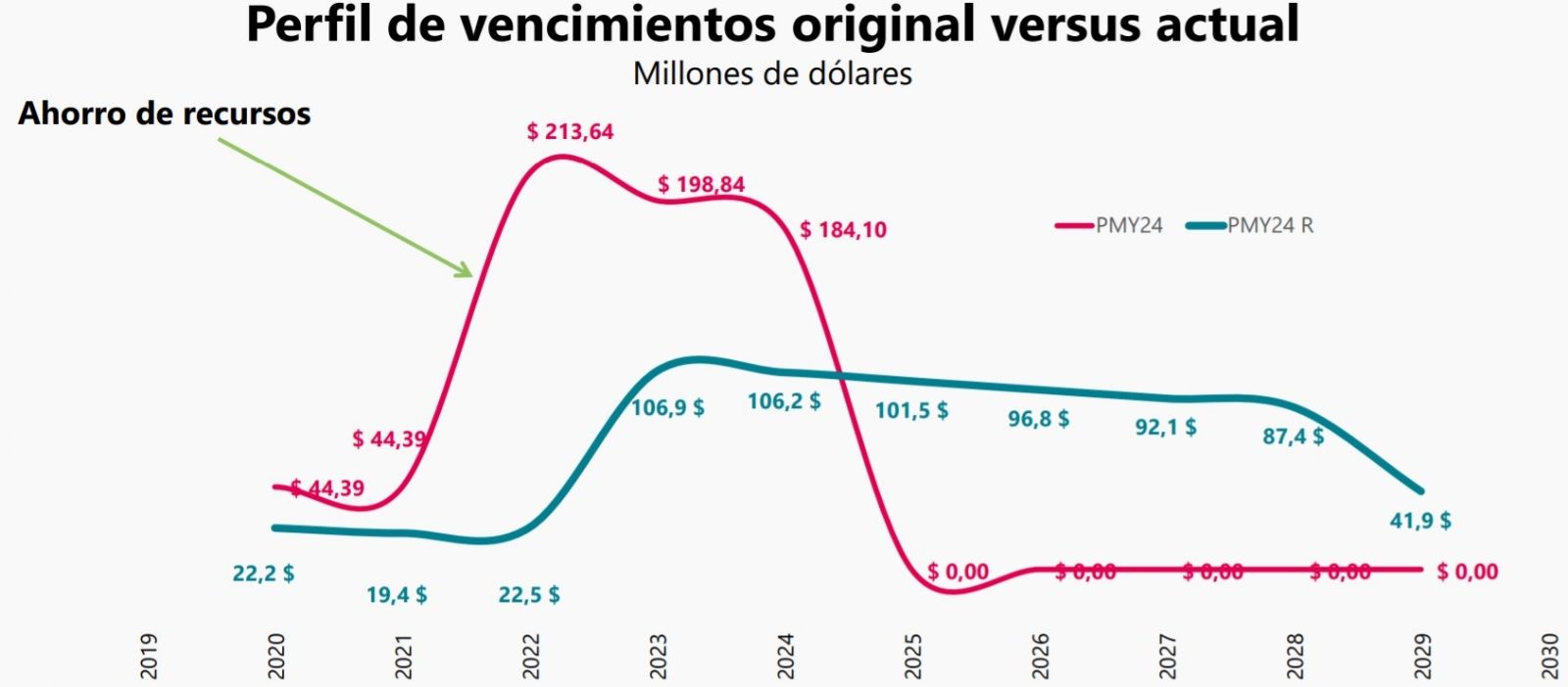 En cambio, con la nueva propuesta, los pagos más fuertes se estiran entre 2023 y 2029. La cuota más alta es de casi 107 millones de dólares (2023) y la más baja, de casi 42 millones de dólares (2029).