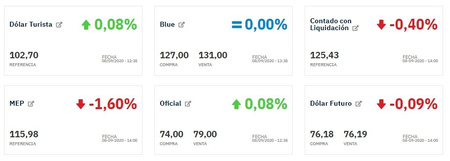 El dólar oficial, por su parte, continúa con su ritmo de devaluación diario y sube un 0,08% este martes, ubicándose en $79 para la venta y $74 para la compra. En tanto el mayorista también sube un 0,08% y se ubica en $74,71 para la venta y $74,51 para la compra.