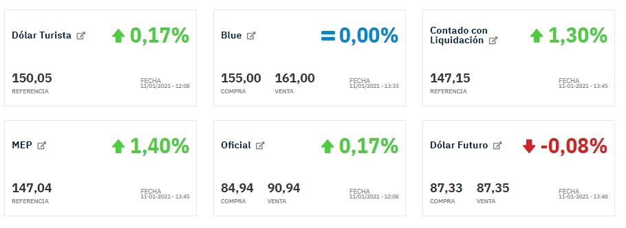 Cabe recordar que durante todo el 2020 el dólar blue subió 121%. Arrancó el año en $75 y llegó a tocar los $195 a fines de octubre, aunque en noviembre y diciembre se estabilizó en torno a los $150. La última semana del año comenzó a subir nuevamente y terminó el 2020 en $166. Durante los primeros días de enero la cotización ha bajado 5 pesos en medio de la volatilidad inicial.