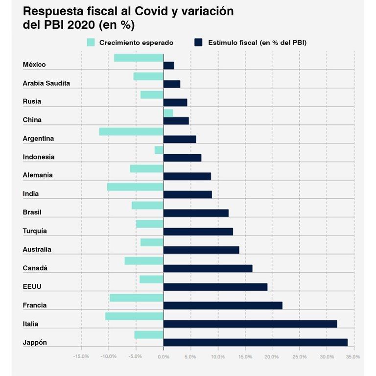 Argentina aparece como el país cuyo PBI más se contrajo y el quinto más bajo estímulo fiscal. Esto explica los pocos recursos que cuenta el país.