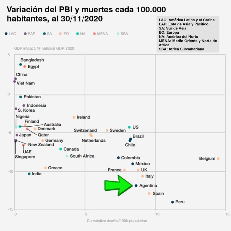 Otro de los gráficos que se expusieron analiza dos ejes importantes. Uno es la variación del PBI en el vertical, y en el horizontal la cantidad de muertos de covid-19 cada 100.000 habitantes, al 30 de noviembre pasado, es decir, hasta hace poco menos de dos meses. Argentina también tiene una muy mala posición.