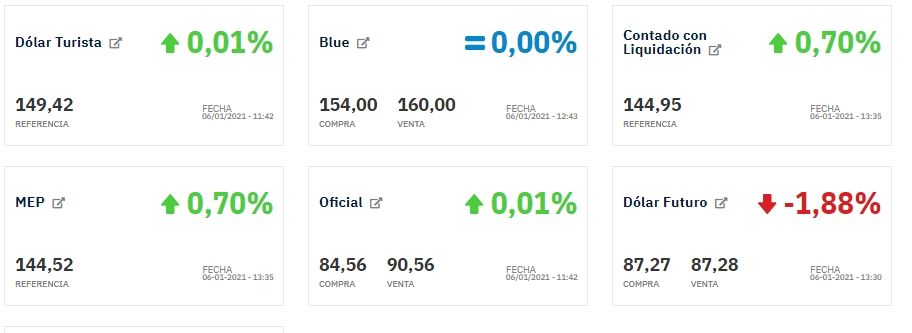 Cabe recordar que durante todo el 2020 el dólar blue subió 121%. Arrancó el año en $75 y llegó a tocar los $195 a fines de octubre, aunque en noviembre y diciembre se estabilizó en torno a los $150. La última semana del año comenzó a subir nuevamente y terminó el 2020 en $166.