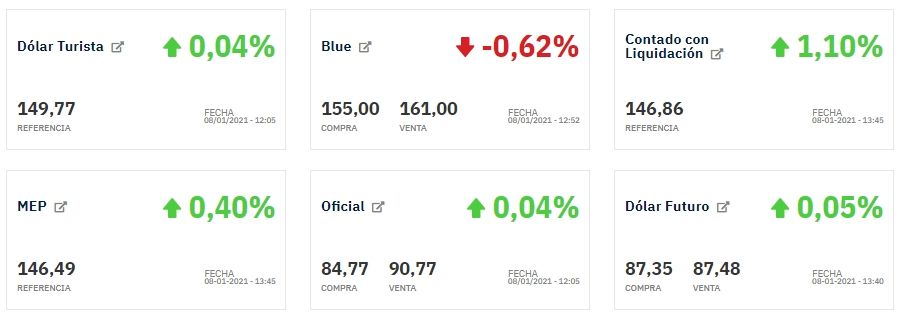 Durante todo el 2020 el dólar blue subió 121%. Arrancó el año en $75 y llegó a tocar los $195 a fines de octubre, aunque en noviembre y diciembre se estabilizó en torno a los $150. La última semana del año comenzó a subir nuevamente y terminó el 2020 en $166. Durante los primeros días de enero la cotización ha bajado 5 pesos en medio de la volatilidad.