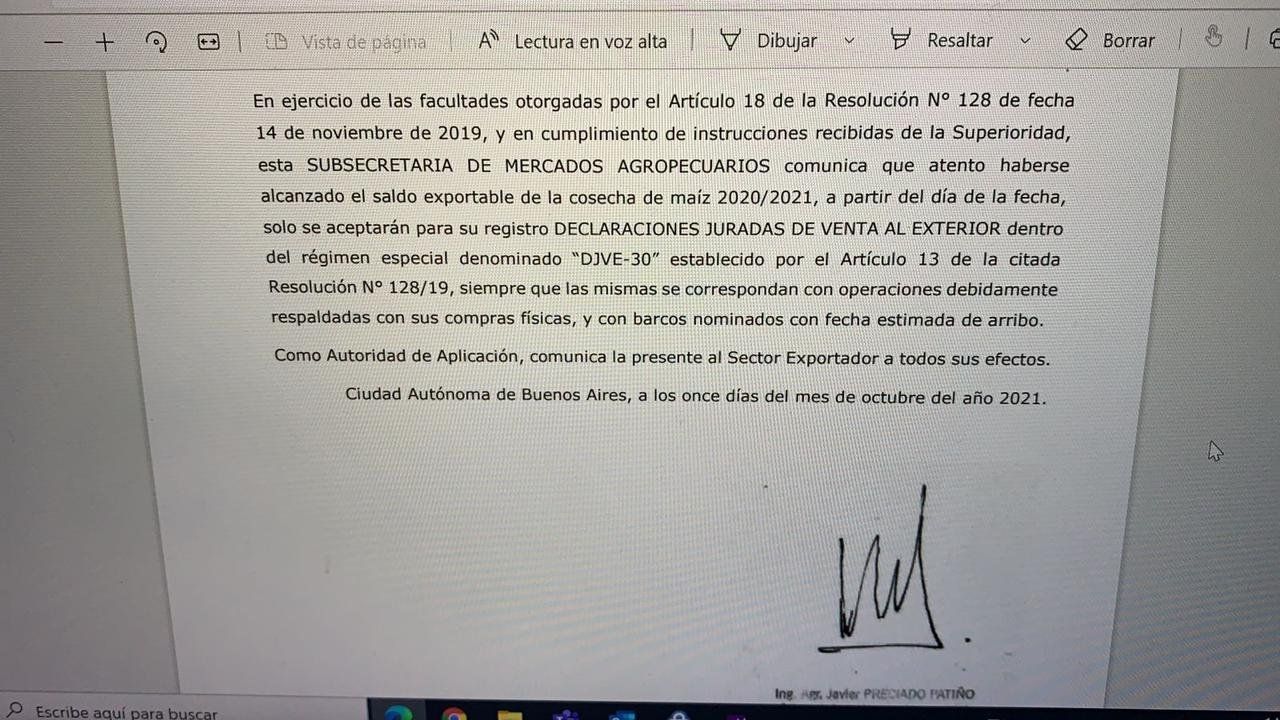 En concreto, el comunicado firmado por el subsecretario de Mercados Agropecuarios, Javier Preciado Patiño, indica: "En ejercicio de las facultades otorgadas por el Artículo 18 de la Resolución N°128 de fecha 14 de noviembre de 2019, y en cumplimiento de instrucciones recibidas de la Superioridad, esta Subsecretaria de Mercados Agropecuarios comunica que atento haberse alcanzado el saldo exportable de la cosecha de maíz 2020/2021, a partir del día de la fecha, solo se aceptarán para su registro declaraciones juradas de venta al exterior dentro del régimen especial denominado 'DJVE-30' establecido por el Artículo 13 de la citada Resolución N°128719, siempre que las mismas se correspondan con operaciones debidamente respaldadas con sus compras físicas, y con barcos nominados con fecha estimada de arribo".