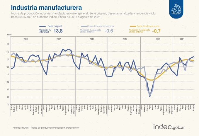 En cuanto a la industria, la entidad detalló que en agosto de 2021, el Índice de producción industrial manufacturero (IPI manufacturero) mostró una suba de 13,8% respecto a igual mes de 2020. En tanto, el acumulado enero-agosto de 2021 presentó un incremento de 19,9% respecto a igual período de 2020. Por su parte, el Índice de la serie desestacionalizada muestra una variación negativa de 0,6% respecto al mes anterior y el índice serie tendencia-ciclo registra una variación negativa de 0,7% respecto al mes anterior.