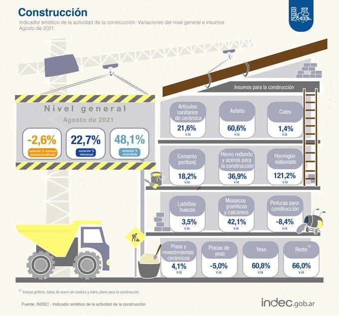 Sobre la actividad de la construcción (ISAC), el Indec indicó que durante agosto el índice mostró una suba de 22,7% respecto a igual mes de 2020. Por su parte, el acumulado de los ocho meses de 2021 del índice serie original presentó una suba de 48,1% respecto a igual período de 2020. En cuento al índice de la serie desestacionalizada, este mostró una variación negativa de 2,6% respecto al mes anterior y el índice serie tendencia-ciclo registra una variación negativa de 1,0% respecto al mes anterior.