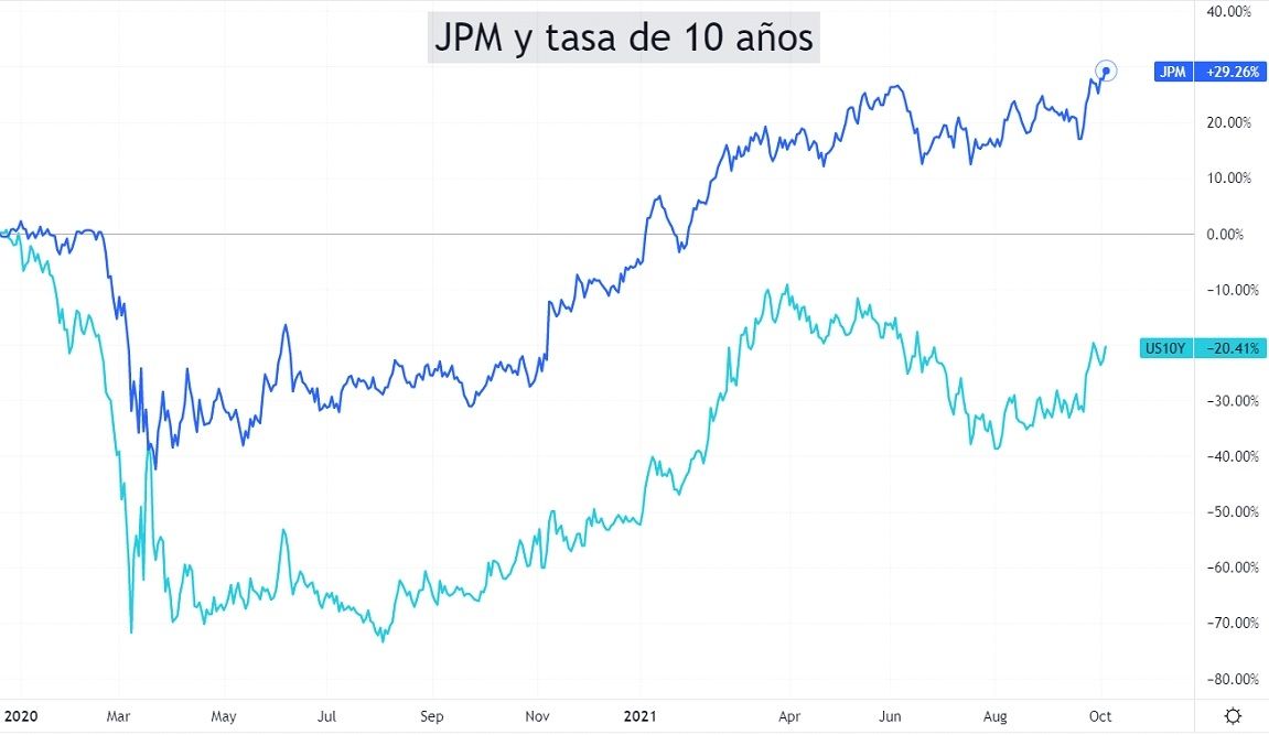 Veamos el rendimiento de JPM y la tasa de 10 años, desde el 2020: