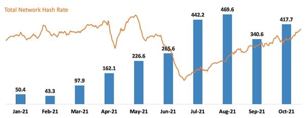Actualmente, la empresa posee más de 27.000 equipos de minería, que le permitieron conseguir durante octubre 418 Bitcoins, llegando a un total de 2.500 en lo que va de 2021.