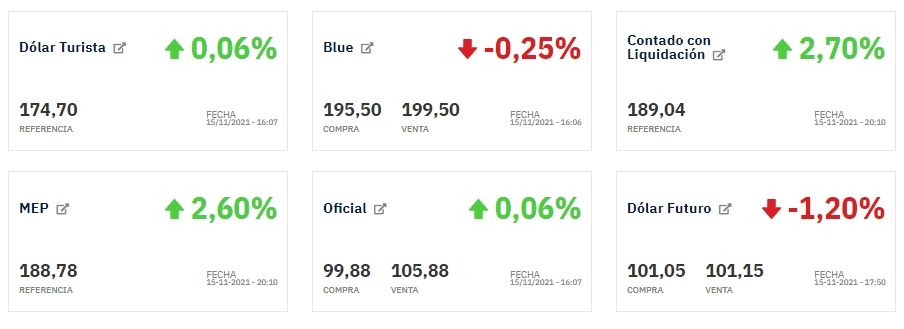Este lunes el dólar blue bajó y se ubicó en $199,50 para la venta, pero los dólares financieros continuaron subiendo. El contado con liquidación subió 2,7% y se ubicó en $189,04, mientras que el dólar MEP o Bolsa subió 2,6% y se ubicó en $188,78.