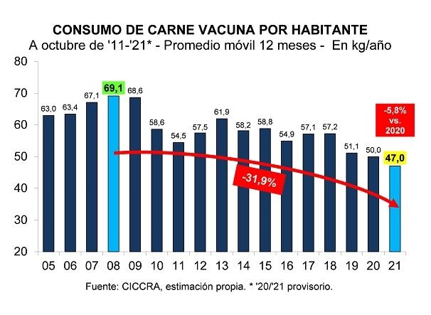 El último informe indica que, actualmente, los niveles han descendido a los niveles más bajos de los últimos cien años, ubicándose en 47 kilos por habitante/año durante octubre. Esto significó una nueva caída del 5,8% contra igual período de 2020.