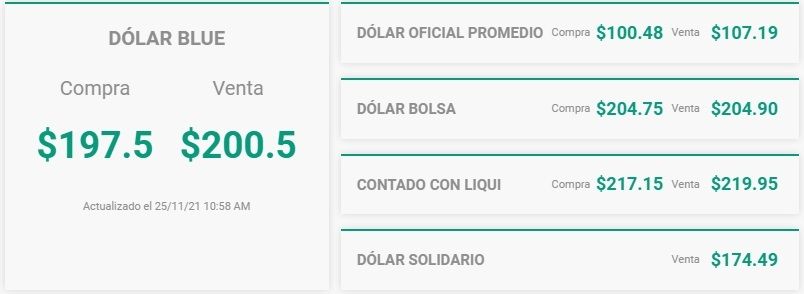 El dólar blue mantiene su tendencia a la baja. Durante la última jornada bajó a 200,5 pesos. Esto se debe a las pocas operaciones que se vienen realizando. La brecha con el oficial es un poco menor al 100 por ciento. Durante la segunda semana de noviembre llegó a su máximo histórico, cuando alcanzó un precio de venta de 207 pesos.