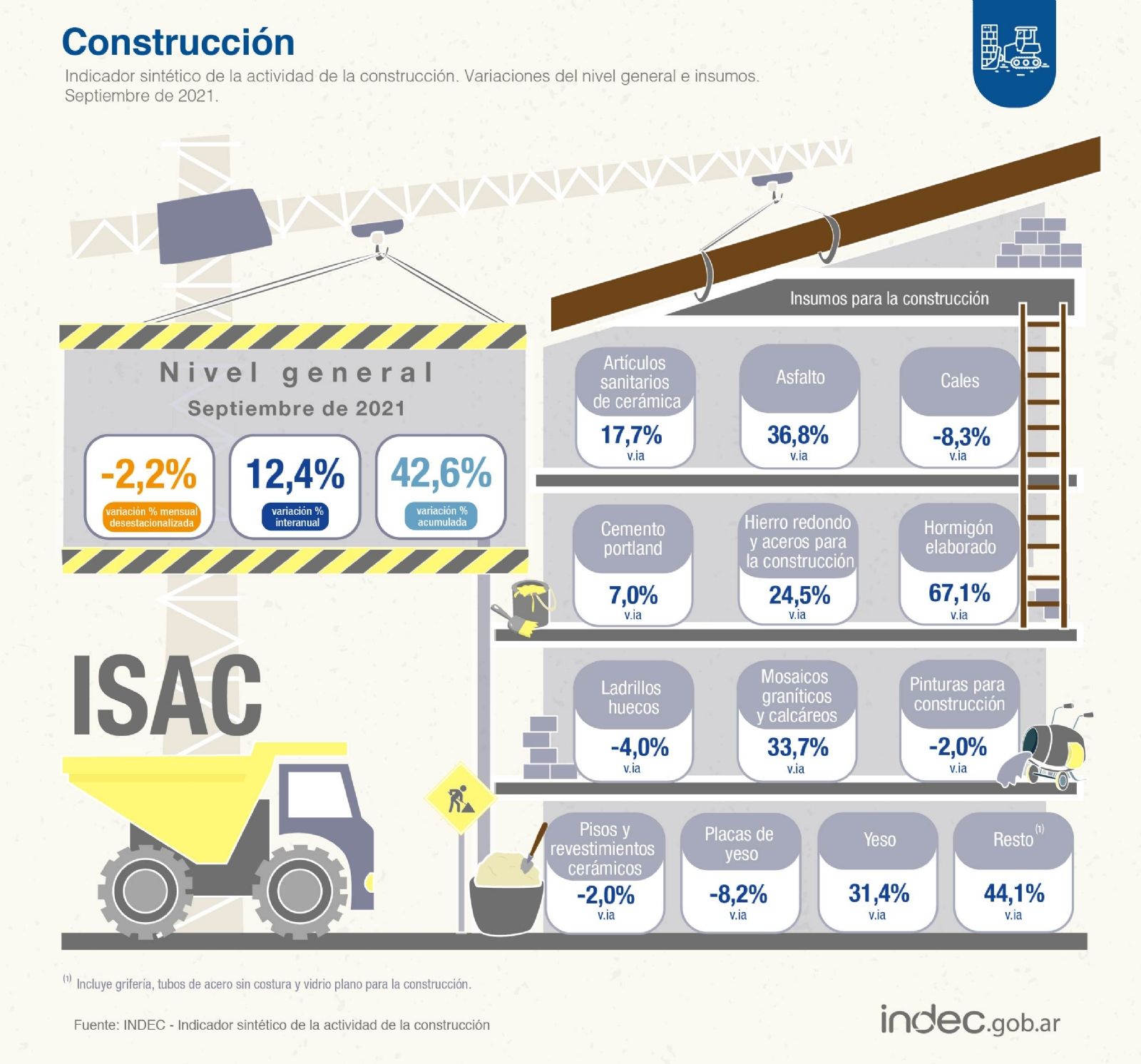 En septiembre de 2021, el Indicador sintético de la actividad de la construcción (ISAC) muestra una suba de 12,4% respecto a igual mes de 2020. El acumulado de los nueve meses de 2021 del índice serie original presenta una suba de 42,6% respecto a igual período de 2020. El índice de la serie desestacionalizada muestra una variación negativa de 2,2% respecto al mes anterior y el índice serie tendencia-ciclo registra una variación negativa de 0,8% respecto al mes anterior.