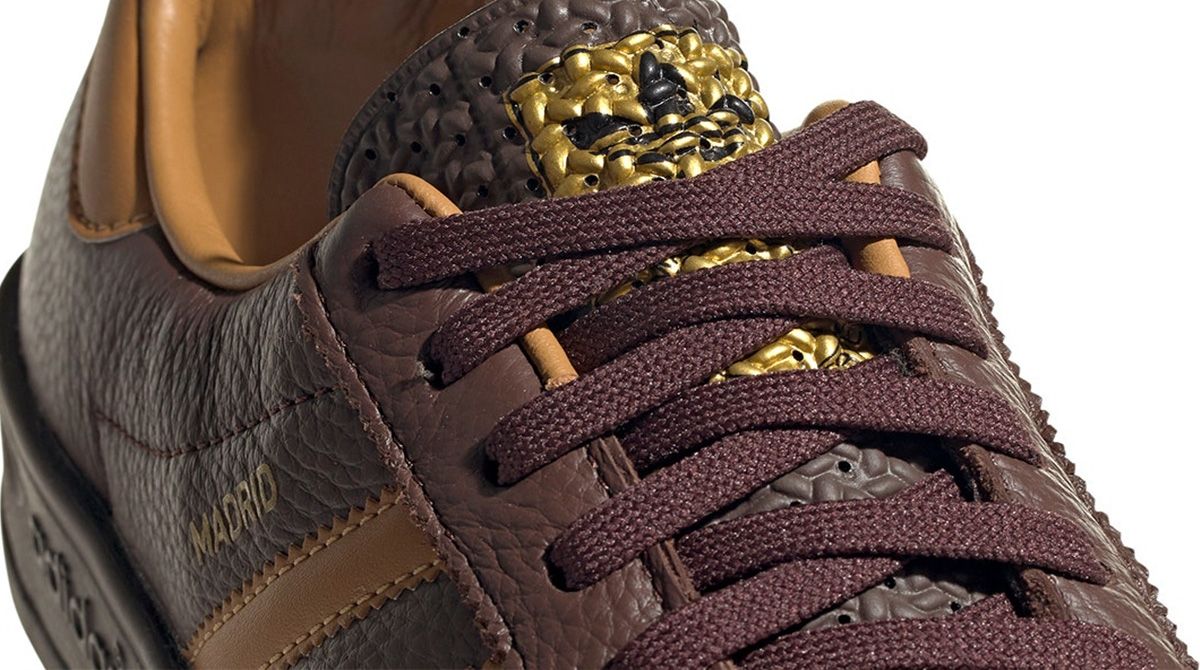 Las zapatillas Madrid cuentan con la misma puntera en forma de "T" en "piel suave", de color marrón. La parte superior o "cuerpo" del calzado se completa con cuero del mismo color, un tono más oscuro, y la clásicas tres tiras y detalles en color suela.