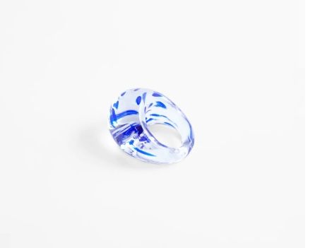 La colección inspirada en la década de los 90's se llama Glass Collection y las piezas están realizadas en cristal inyectado. Algunos son una sola pieza, otros están engarzados en una base que se une a la circunferencia del anillo.