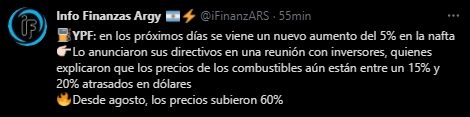 Según consigna Clarín, con los incrementos recientes, YPF se va acercando al importe de un dólar (al tipo de cambio oficial) por litro de nafta despachado, un indicador que fue casi una constante desde hace 30 años.