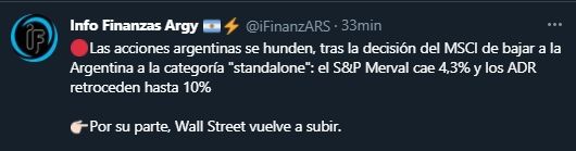 Muchos atribuyen la suba a la decisión del MSCI, que ayer degradó a la Argentina de mercado emergente a "standalone". Los bonos y acciones argentina muestran importantes bajas este viernes tras la noticia que se conoció ayer a la tarde.
