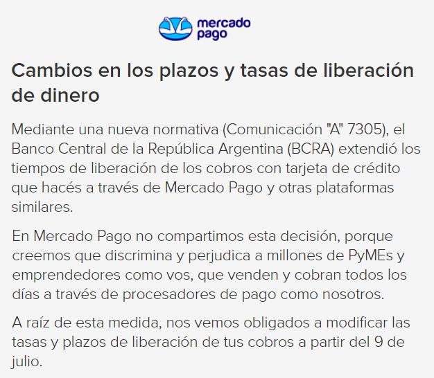 "A raíz de esta medida, nos vemos obligados a modificar las tasas y plazos de liberación de tus cobros a partir del 9 de julio", agrega la empresa.