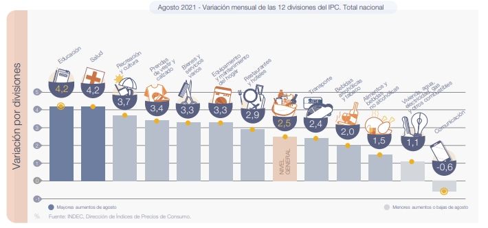 Las dos divisiones de mayor incremento en el mes fueron Educación (4,2%) y Salud (4,2%). En esta última incidió principalmente el alza en Gastos de prepagas y Productos medicinales, artefactos y equipos para la salud. La suba en la división Alimentos y bebidas no alcohólicas fue del (1,5%). En tanto, la división Comunicación (-0,6%) presentó una caída en agosto, y el menor aumento del mes fue en Vivienda, agua, electricidad, gas y otros combustibles (1,1%) que, en algunas regiones, también registró caídas
