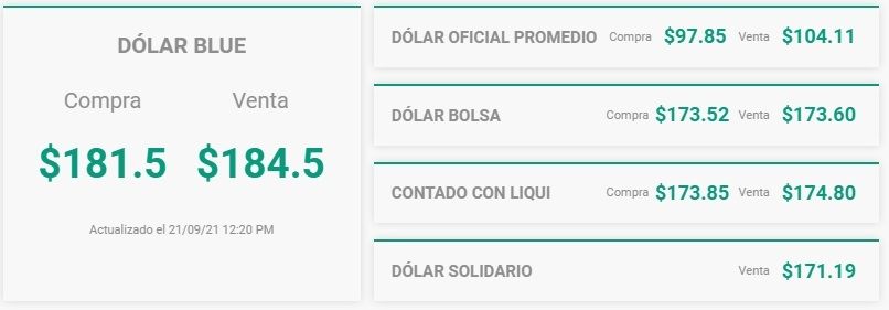 Hasta el momento, la compra se mantiene en 181,5 pesos para el dólar blue. Las demás cotizaciones se mantienen estables pero con leve tendencia alcista. El "contado con liqui" sigue con muchas variaciones, y al mediodía se vende a 174,80 pesos.