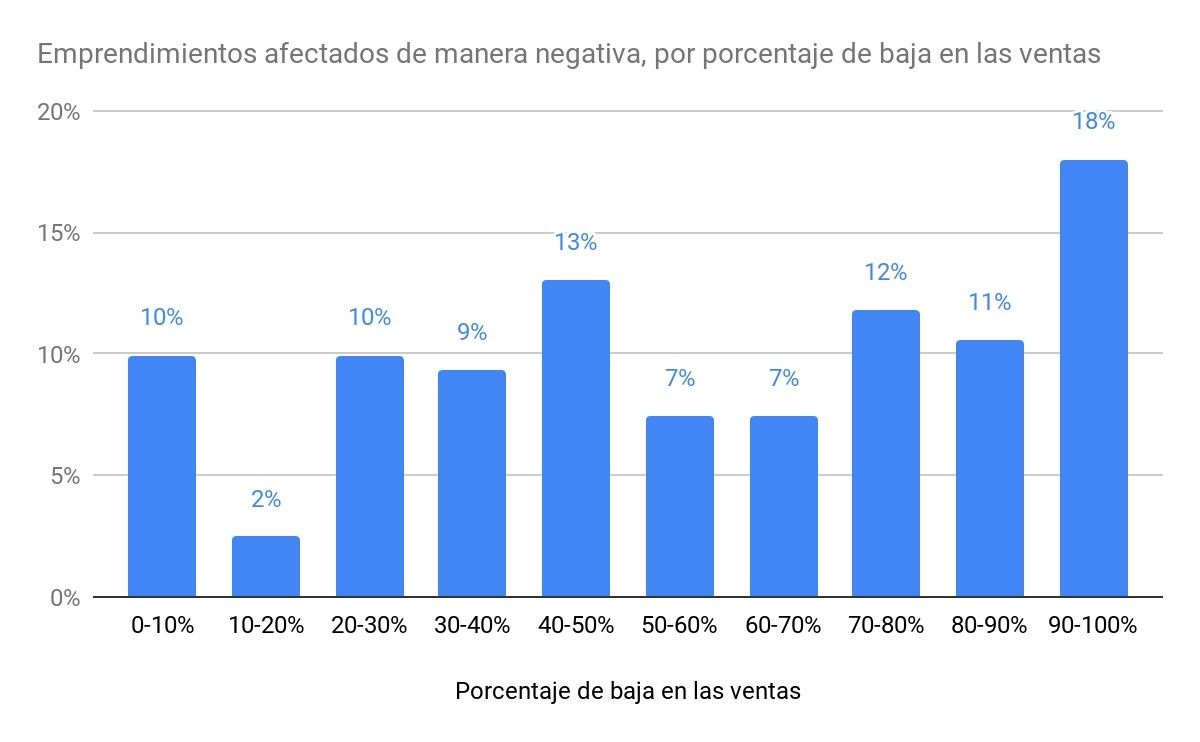 Como era de esperar, cerca de la mitad de los emprendimientos afectados por la pandemia (40%) sufrió entre un 70% y un 100% de baja en las ventas. Esta baja parece haber afectado a todos los rubros por igual.