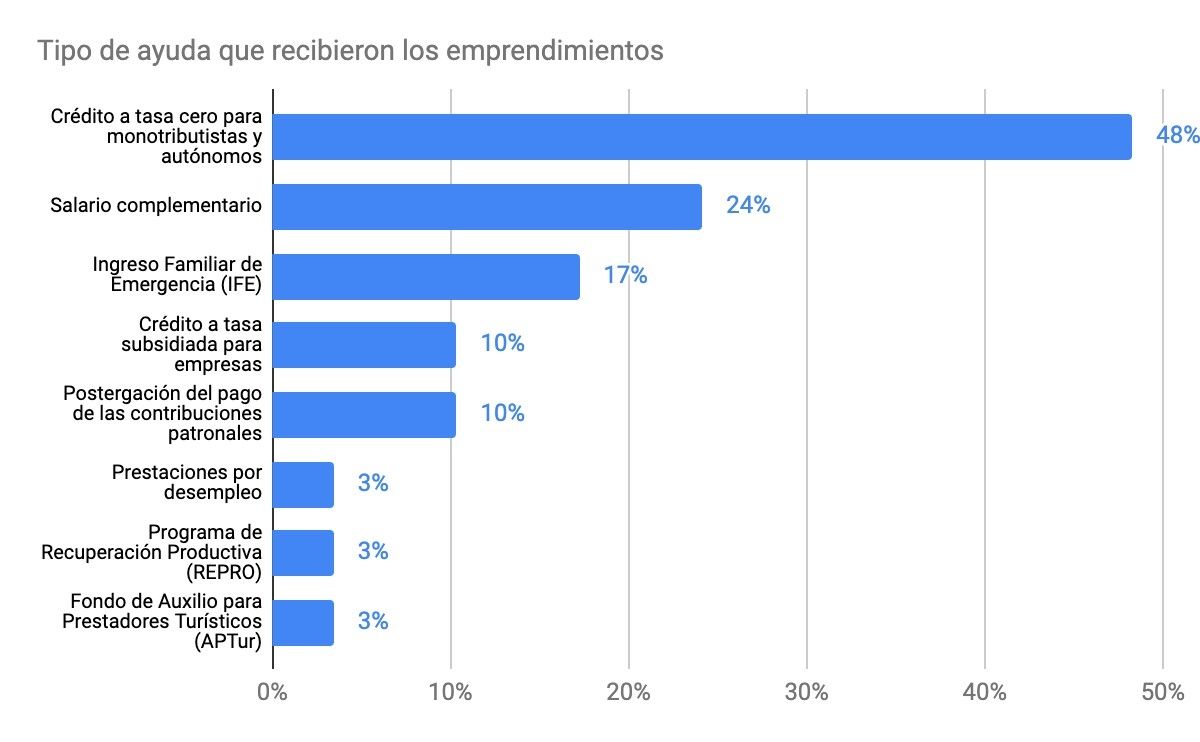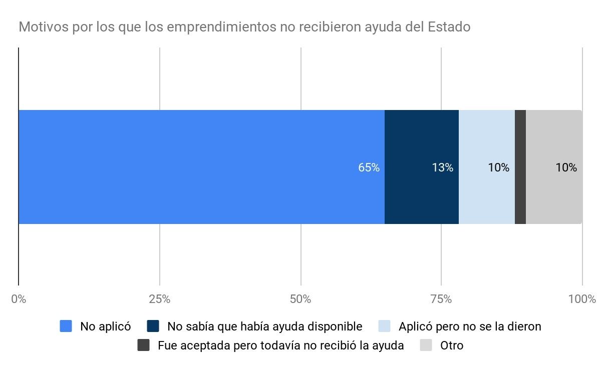 La mayoría de los emprendimientos afectados (82%) reportó que no recibió ningún tipo de ayuda del Estado. El grueso de esos emprendimientos (65%) sabía de la existencia de medidas de apoyo pero no aplicó.