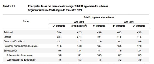 En concreto, en el segundo trimestre de 2021, la tasa de actividad (TA), que mide la población económicamente activa, (PEA) sobre el total de la población, alcanzó el 45,9%; la tasa de empleo (TE), que mide la proporción de personas ocupadas con relación a la población total, se ubicó en 41,5%; y la tasa de desocupación (TD), personas que no tienen ocupación, están disponibles para trabajar y buscan empleo activamente, como proporción de la PEA, se ubicó en 9,6%.