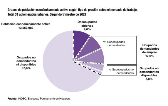 El índice de desempleo se ubicó en el 9,6% al cierre del segundo trimestre, por debajo del 13,1% de igual período del 2020, y del 10,2% del primer trimestre del corriente año, informó esta tarde el Instituto Nacional de Estadística y Censos (Indec).