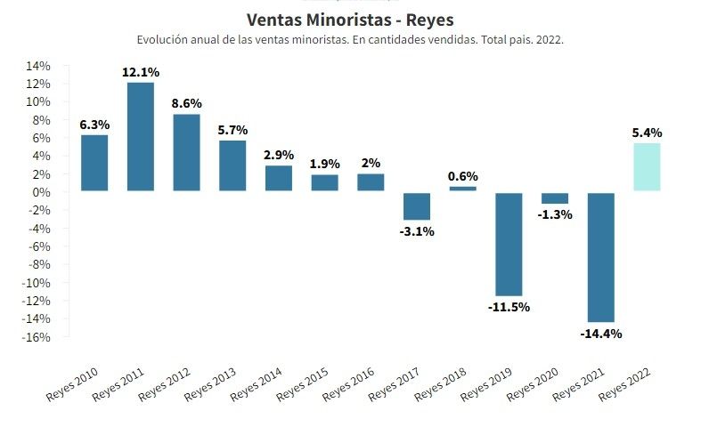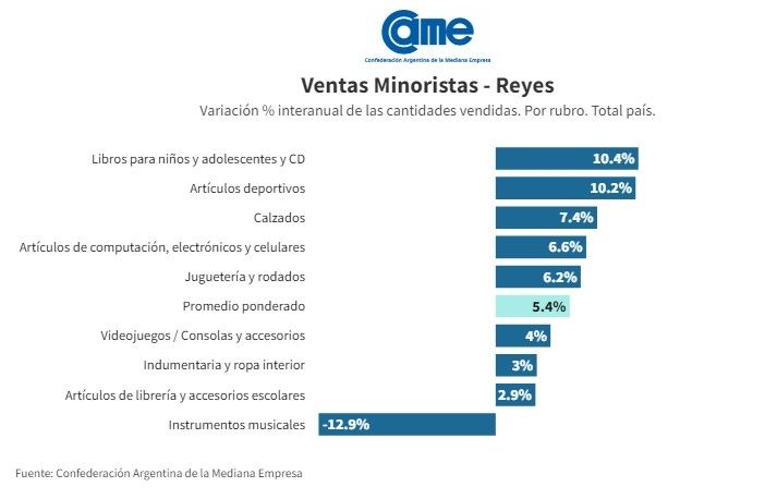 Según el informe las ventas minoristas por el Día de Reyes crecieron 5,4% en cantidad este año respecto de 2021, con mayor demanda de artículos deportivos y de recreación, seguidos por calzado de playa, indumentaria, y juegos para agua y arena.