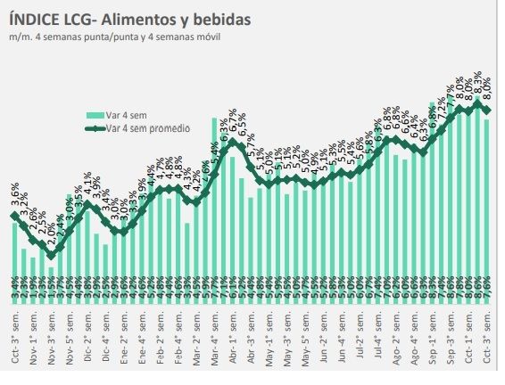 La inflación de alimentos y bebidas en la última semana trepó a 1,8%, tres décimas más que la semana anterior y de esta manera acumula nada menos que 8% en las últimas cuatro semanas.