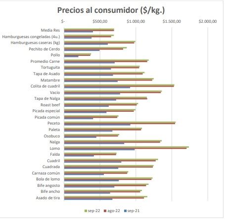 Los precios de la carne vacuna registraron un aumento de 1,8% en septiembre y acumulan 67,2% en los últimos doce meses, tomando los precios promedio de 22 cortes, aunque la media res tuvo un incremento de 73,3% en promedio.