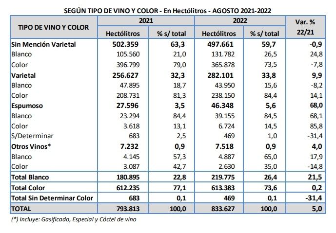 Es que en “tipo de vino y color sin mención de varietal” la baja general es de 0,9 %, con 24,8% para los blancos y -7,8 % para los de color. Los espumantes, por su lado, registraron un salto de 68% en la comparación mensual, aunque partiendo de volúmenes mucho más bajos.