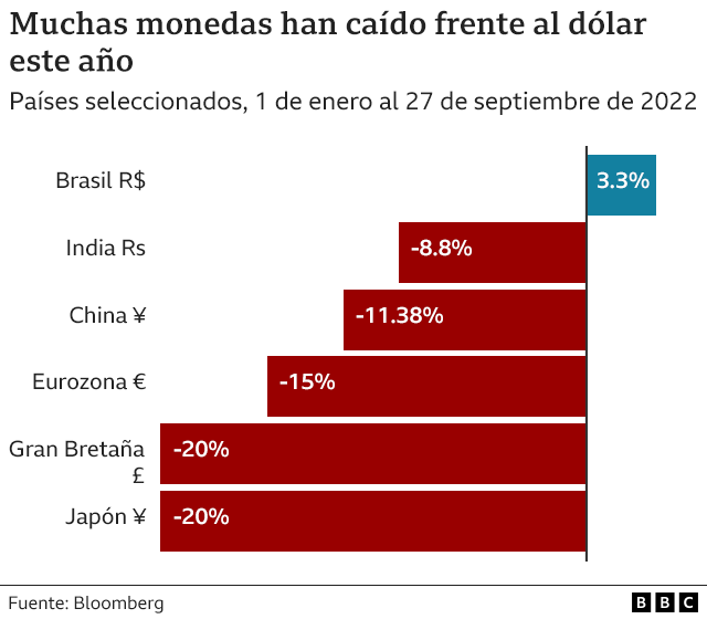 El índice DXY, que mide el valor del dólar estadounidense frente a un promedio de otras seis monedas importantes, incluidos el euro, la libra y el yen, ha subido un 15% en 2022. Según esta medida, el dólar está en su punto más alto en 20 años.