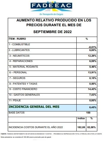 Con las heridas aún abiertas por la paritaria de los neumáticos y la atención sobre las negociaciones salariales de camioneros, el índice de Costos de Transporte elaborado por la Federación Argentina de Entidades Empresarias del Autotransporte de Cargas (Fadeeac) registró en septiembre un aumento de 6,45 %.